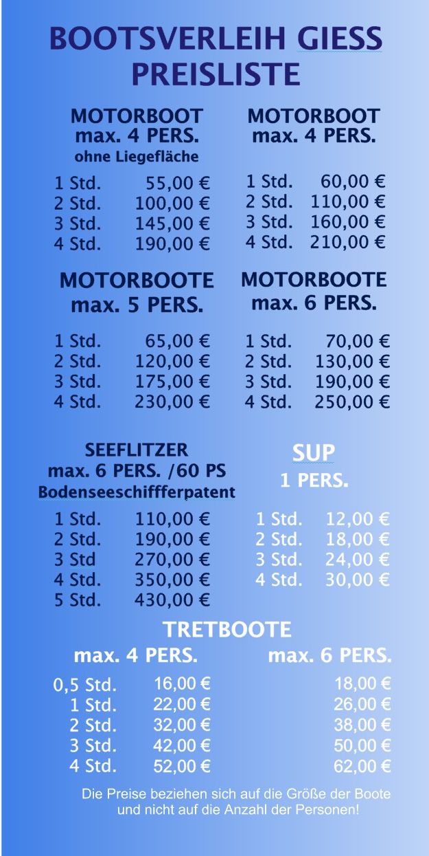 Die Preise beziehen sich auf die Größe der Boote und nicht auf die Anzahl der mitfahrenden Personen!
